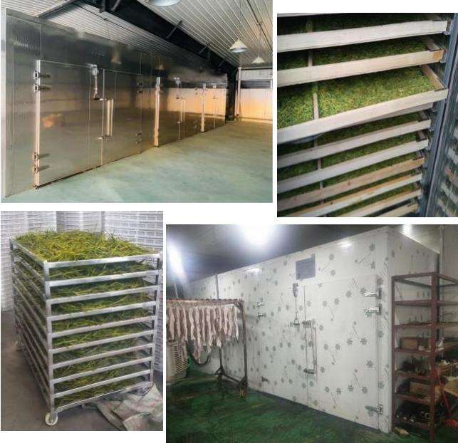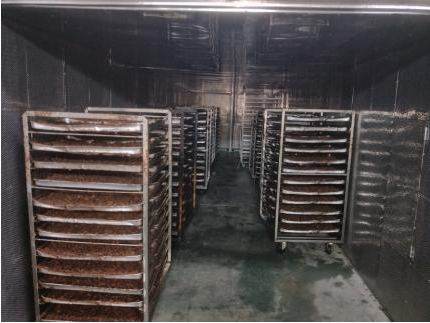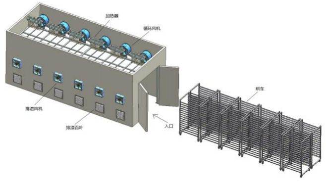 QD-D型热风循环烘干房:该烘房在顶部设置有风道隔层,与左右两边风道夹层连通,利用顶部的循环风机将热风均匀输送至隔层下物料上,带动物料升温, 同时带走物料水分,沿侧面风道回到隔层循环利用。