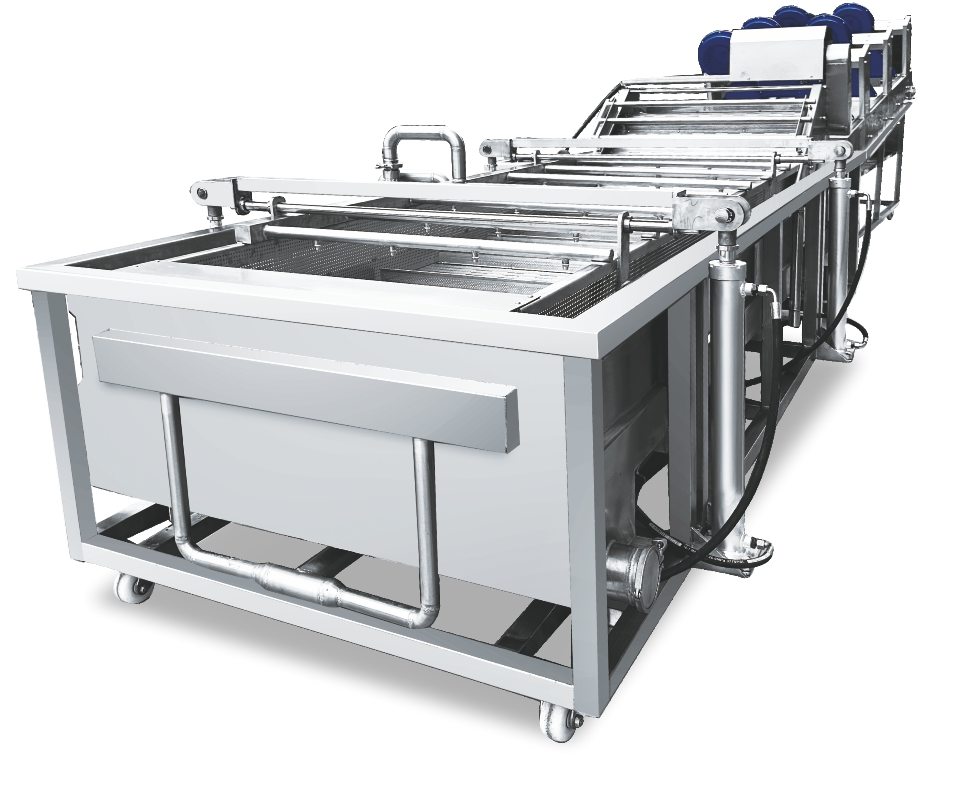 本机采用气泡翻滚/刷洗/喷淋技术,更大限度的对物料进行清洗,流水线中各单机可根据用户各自不同的加工特点量身定制,更大程度满足工艺要求,清洗运行程度无级可调,用户可根据不同的清洗内容任意设定,该机结构紧凑,自动化程度高,适合各种加工规模企业使用。设备带有循环水泵和过滤水箱,实现清洗水循环使用,节约用水,根据实际生产情况补充更换新水。输送带电机,可实现调节变速功能,被清洗的蔬菜经过网健输送,自动送料,自动出料,根据生产需要调节输送带输送程度,操作及维护简便,工作效率高,是更理想的食品清洗设备。