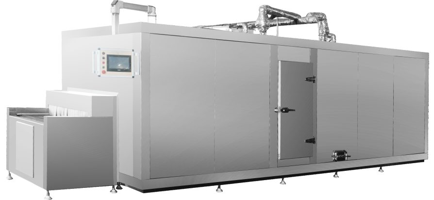 隧道式速冻机是一种节能、高效、多用途、经济型的速冻设备,适用于中小型速冻食品的加工。设备采用了卫生级不锈钢内胆,输送带根据产品的不同分别采用了网带式,板链式、防粘布式等。设备主要由制冷系统、速冻室、输送系统、控制系统等组成。工作人员将装有待冻食品的冻品盘通过速冻入口进入速冻机,在传送带的作用下通过速冻室从速冻出口将速冻好的产品送出。设备主要控制部位采用进口部件,控制系统采用了自动控温,自动控制等,解决了人控的不足。制冷机采用了进口压缩机,保证了设备运行的可靠性。